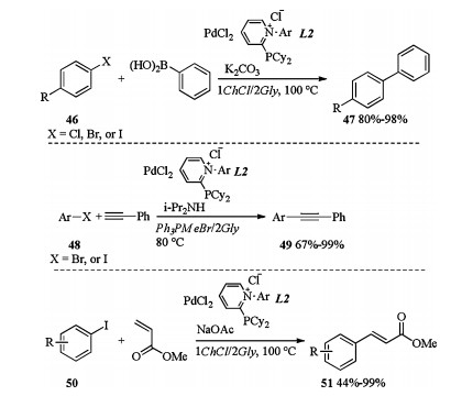 PdCl2 in combination with cationic pyridiniophosphine ligands in DESs, was successfully applied to different cross coupling reactions like Suzuki-Miyaura, Sonogashira or Heck couplings [24]. As shown in Scheme 17, subjection of halides 46 and phenylboronic acid to PdCl2/L2 catalyzed Suzuki-Miyaura coupling in 1ChCl/2Gly gave the desired biaryls 47 in good to excellent yields. PdCl2/L2 catalyzed Sonogashira coupling between halides 48 and phenyl acetylene occurred in Ph3PMeBr/2Gly and led to the desired coupling products 49 in 67%-99% yields. When 1ChCl/2Gly was applied as a solvent, PdCl2/L2 catalyzed Heck coupling between iodide 50 and methyl acrylate proceeded smoothly to form corresponding products 51 in moderate to excellent yields. In Suzuki and Sonogashira couplings, the catalytic system could be recycled up to 5 times without a significant drop in the catalytic activity.
