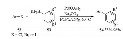 When aryltrifluoroborates were applied as coupling partners, ligand-free Pd(OAc)2 catalyzed Suzuki-Miyaura couplings could be carried out in DES [25]. With Na2CO3 as a base and 1ChCl/2Gly as a sustainable and environmentally responsible solvent, Pd(OAc)2 catalyzed Suzuki-Miyaura couplings between aryl halides 52 and versatile, moisture-stable potassium aryltrifluoroborates 53 proceeded efficiently and chemoselectively in air, furnishing a series of valuable biaryls and terphenyl derivatives 54 in 53%-98% yields (Scheme 18). Catalyst, base and DES have been facile and successfully recycled up to six times with an E-factor as low as 8.74.