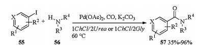 The first ligand free Pd catalyzed aminocarbonylation of (hetero)aryl iodides in DESs was reported by Capriati and Salomone in 2018 (Scheme 19) [26]. The reaction of iodides 55 with amines 56 under a pressure of CO using Pd(OAc)2 as a catalyst and K2CO3 as a base straightforwardly led to the desired aminocarbonylated product 57 in moderate to excellent yields in 1ChCl/2Urea or 1ChCl/2Gly. The catalytic system could be recycled easily and remained active for over 5 cycles.