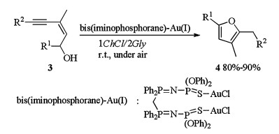 The first cycloisomerisation reaction of (Z)-enynols in DES catalyzed by bis(iminophosphorane)-Au(Ⅰ) was also reported by Álvarez (Scheme 2) [11]. Bis(iminophosphorane)-Au(Ⅰ) catalyzed cycloisomerisation of (Z)-enynols 3 proceeded smoothly in 1ChCl/2Gly at rt under air without co-catalyst and gave furans 4 in good to excellent yields. Compared to other solvents like water, glycerol or ionic liquid ([BMIM][BF4]), DESs enabled the reaction proceeding in higher rate. The catalytic system could be reused for 10 consecutive times without any loss of activity or selectivity.