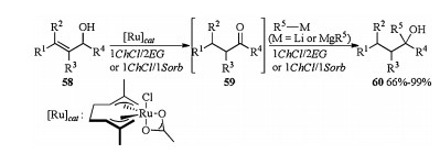 In 2017, Álvarez and Capriati reported Ru catalyzed one-pot sustainable synthesis of tertiary alcohols through redox isomerization of allylic alcohols assembled with the chemoselective addition of organolithium or organomagnesium reagents to the in situ formed ketones employing DESs as environmentally friendly reaction solvents. When allylic alcohols 58 and catalyst [Ru(η3:η3-C10H16)Cl(κ2-O, O-CH3CO2)] in 1ChCl/2Urea or 1ChCl/1Sorbitol (Sorb) solvent was heated at 50 or 75 ℃ followed by the addition of n-BuLi/n-Bu2Mg as the organometallic reagent to the reaction mixture, 58 could be converted into the corresponding tertiary alcohols 60 in moderate to excellent yields without any additional step of purification or isolation of transiently formed ketones 59 (Scheme 20) [27].