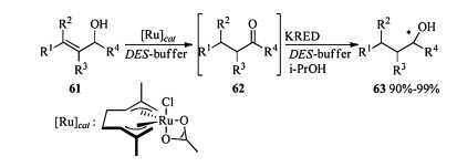 One-pot ruthenium-catalyzed allylic alcohol isomerization followed by asymmetric bioreduction in DES-buffer mixtures could yield chiral alcohol [28]. Subjection of allylic alcohol 61 to Ru(η3:η3-C10H16)Cl(κ2-O, O-CH3CO2) catalyzed isomerization and the following purified ketoreductases (KRED) catalyzed reduction provided chiral alcohols 63 in excellent yields. This reaction proceeded in one-pot manner and intermediates 62 was not required to be isolated (Scheme 21).