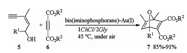 The above catalytic system could be applied to one-pot tandem cycloisomerisation/Diels-Alder reaction as well. In the presence of bis(iminophosphorane)-Au(Ⅰ), (Z)-enynol 5 reacted with activated diethyl acetylenedicarboxylate 6 in 1ChCl/2Gly at 45 ℃ under air leading to the clean and high-yield formation (85%-91%) of the desired oxabicyclic products 7 (Scheme 3) [11].