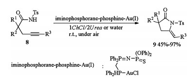 When water or DES (1ChCl/2Urea) was used as solvents, Au(Ⅰ) catalyzed cycloisomerization of alkyny amides 8 occurred at room temperature without co-catalysts and protecting atmosphere and produced corresponding alkylidene lactams 9 in moderate to excellent yields (Scheme 4) [12]. Catalyst was recycled up to four consecutives runs albeit with a decrease in activity after each recycling step. This is the first example about the recyclability of a catalyst in cycloisomerization of alkynyl amides.