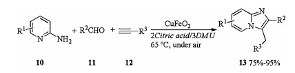 In 2014, Zhang investigated superparamagnetic CuFeO2 nano-particles catalyzed one-pot, three components reaction in DESs [13]. Treatment of 2-aminopyridines 10, aldehydes 11, and alkynes 12 with CuFeO2 in DES (2Citric acid/3dimethylurea(DMU)) at 65 ℃ yielded corresponding imidazo[1, 2-a]pyridines 13. The catalytic system could be successfully recycled up to six times with keeping its catalytic performance (Scheme 5).