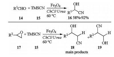 Magnetic Fe3O4 nanoparticle catalyzed eco-friendly synthesis of cyanohydrins in DES was reported by Azizi in 2015. In the presence of Fe3O4 catalyst, aldehydes 14 reacted with TMSCN 15 and afforded corresponding cyanohydrins 16 in moderate to excellent yields. This catalytic system was also used for synthesis of β-hydroxy nitriles. Treatment of epoxides 17, 15 with Fe3O4 catalyst afforded corresponding β-hydroxy nitriles 18 in good to excellent yields. The main products isolated were those arriving from the attack of the nucleophile to the less hindered position of the asymmetrical epoxide (Scheme 6) [14].