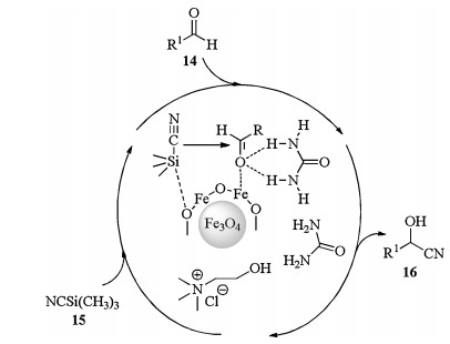 A plausible mechanism for the synthesis of cyanohydrins was shown in Scheme 7. The reaction probably took place via activation of the carbonyl group in 14 with hydrogen bonding ability of deep eutectic solvent. Magnetic Fe3O4 nanoparticles catalyst could serve the dual role in this system, as a Lewis acidic surface and so could activate the carbonyl group by coordination of the Fe in the Fe3O4. Furthermore, Fe3O4 assisted in improving reactivity of TMSCN through weak interaction between oxygen in Fe3O4 with silicon in TMSCN, leading to the formation of intermediate. The nucleophilic attack of TMSCN on activated carbonyl formed corresponding products 16 [14].