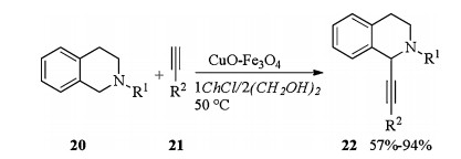 Cross-dehydrogenative coupling in DES catalyzed by copper(Ⅱ) oxide impregnated on magnetite was introduced by Ramón in 2016 (Scheme 8) [15]. Subjection of tetrahydroisoquinolines 20 and alkynes 21 to CuO-Fe3O4 catalyzed dehydrogenative coupling in 1ChCl/2(CH2OH)2 gave corresponding products 22 in moderate to excellent yields. The presence of 1ChCl/2(CH2OH)2 was necessary for achieving reasonable yields since the reaction did not occur in some VOCs like DMSO, MeOH, toluene, H2O, DMF, etc. The catalytic system could be recycled up to ten times without detrimental effect on the yield of the reaction.