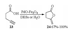Palladium on magnetite accelerated cycloisomerization of 4-pentynoic acid in H2O as well as in DESs (1ChCl/2urea, 1acetylcholine chloride (AcChCl)/2urea, 1ChCl/1resorcinol, 1ChCl/2EG, 1ChCl/2Gly) was also described in 2018 by Ramón [16]. Treatment of 4-pentynoic acid 23 with PdO-Fe3O4 catalyst in DESs or water formed the desired enol-lactone 24 in 67%-100% yields (Scheme 9).