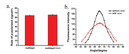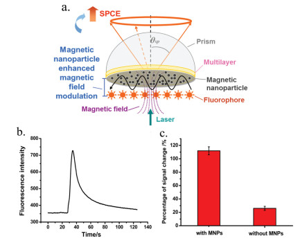Figure 1. (a) The schematic diagram for MNPs enhanced magnetic field modulation of SPCE; (b) The response of SPCE with MNPs on the substrate to the pulsed magnetic field (1.8 T) and (c) the percentage of signal changes with and without MNPs on the substrate after the magnetic field application.Due to the dependence of SPCE property on the composition of experimental substrate and the weak surface plasmon resonance effect of MNPs, the introduction of MNPs is possible to influence the properties of SPCE. The basic properties of SPCE with MNPs modification were investigated. The SPCE signal possessed highly p-polarized emission with a good angular distribution around 66° (Fig. 2). The comparison of SPCE properties with and without MNPs modification is shown in Fig. 3. It can be seen that the polarization was remained about the same, but the emission distribution angel showed a light displacement with an obvious peak broadening after the modification (the half peak width changed from 14.2° to 23.9°), which was attributed to the change in refractive index and the weak surface plasmon resonance effect of MNPs.
