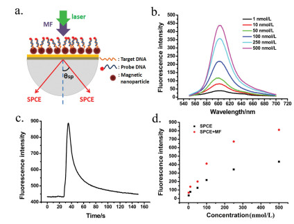 Figure 4 (a) The schematic diagram of the modification procedure for ssDNA detection; (b) The SPCE spectra for the different concentration of target DNA modified on magnetic multilayer with the magnetic nanoparticles; (c) The response of the SPCE signal to a pulsed magnetic field for target DNA of 500 nmol/L; (d) The relationship between the SPCE intensity with and without a pulsed magnetic field and the concentration of target DNA.