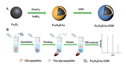 Figure 1. (A) Synthesis procedure of Fe3O4@Au-GSH and (B) workflow of glycopeptides enrichment by Fe3O4@Au-GSH.The morphologies and dimensions of Fe3O4@Au and Fe3O4@AuGSH were investigated by TEM. The results shown in Fig. 2A indicated that Au NPs were successfully adhered on the surface of Fe3O4 and the as-prepared Fe3O4@Au had an average diameter of 189 nm (Fig. S1A in Supporting information). As displayed in Fig. 2B, after GSH was introduced into Fe3O4@Au NPs, the average diameter of the finally material increased about 30 nm (Fig. S1B in Supporting information), suggesting the successful synthesis of Fe3O4@Au-GSH.