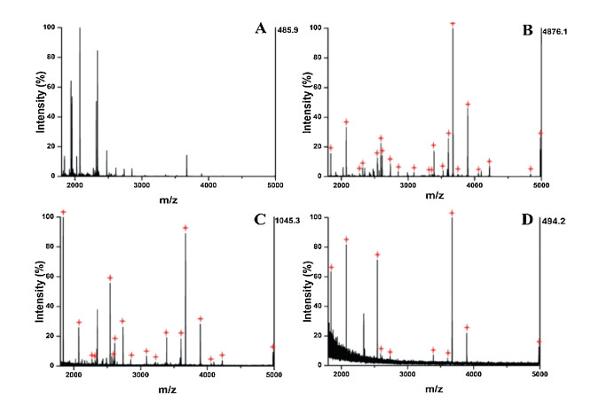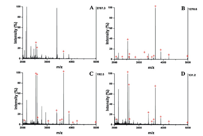 The specificity of glycopeptides capture by Fe3O4@Au-GSH were also evaluated by the mimic samples containing tryptic digests of HRP and BSA (non-glycoprotein) at different mass ratios (1:30, 1:50, 1:100) and the results were shown in Fig. 4. The mass spectrum of the mimic complex samples indicated that only nonglycopeptides could be observed, whereas 3 peaks were detected for glycopeptides with a mass ratio of 1:50 without treatment (Fig. 4A). After enrichment by Fe3O4@Au-GSH, 14 and 13 glycopeptides signals were identified when the mass ratio was 1:30 (Fig. 4B) and 1:50 (Fig. 4C), respectively. Even when the ratio enhanced to 1:100, 11 peaks could still detected with moderate intensity (Fig. 4D). Based on the satisfactory results mentioned above, it is expected that the proposed Fe3O4@Au-GSH with low detection limit and high selectivity could be applied to more complex matrix.
