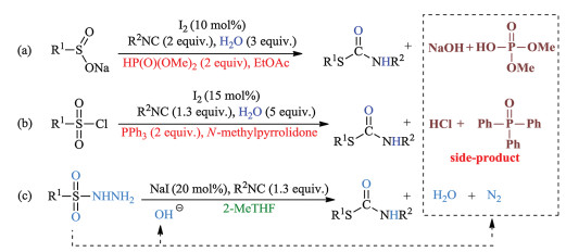 Sulfur-containing compounds have received considerable attention from organic and medicinal chemists due to their versatility in organic synthetic procedures and their valuable biological activities [6]. Among them, the S-thiocarbamates is an essential ingredient in many pharmaceuticals and agrochemicals, and they have also been employed as important building block in organic synthesis [7]. During the past few decades, numerous efforts have been made to prepare such motifs. However, most synthetic protocols have one or more disadvantages, such as the usage of highly harmful chemical reactants (monoxide, phosgene, isocyanates and thiols), harsh reaction conditions and narrow scopes [8]. Recently, Wei and coworkers pioneered the molecular iodine-catalyzed synthesis of thiocarbamates through multicomponent reaction [9] of aryl sodium sulfinates, isonitriles and water in the presence of dimethyl phosphite (2 equiv.) as the reductant in ethyl acetate (EtOAc) [10]. Very recently, our group developed the I2-catalyzed synthesis of thiocarbamates with sulfonyl chlorides using triphenylphosphine (PPh3, 2 equiv.) as the reductant in N-methylpyrrolidone (NMP) [11]. However, these methods employed a lot of petroleum based volatile organic chemicals as the reaction medium. Moreover, they still require a large amount of toxic phosphorus-containing compounds as the reductants, thus plenty of harmful chemical waste is inevitably produced and the tedious organic solvent exaction is inevitable.
