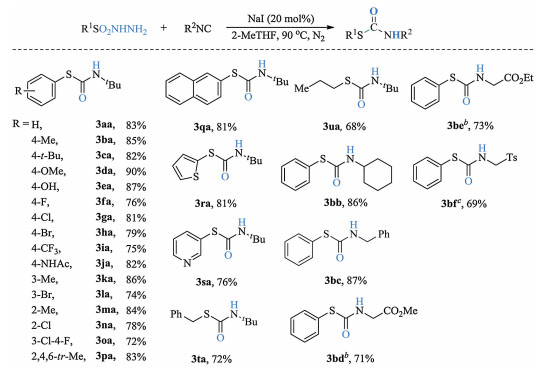 Benzenesulfonylhydrazine (1a) with tert-butylisonitrile (2a) was chosen as a model reaction for the condition optimization. By employing 10 mol% KI as a catalyst under an air atmosphere at 90 ℃, a 64% NMR yield of S-phenyl tert-butylcarbamothioate (3aa) was obtained after 4 h when 2-MeTHF was applied as a reaction medium (Table 1, entry 1). To increase the reaction efficiency, various other catalysts (entries 2–7) were investigated and the results showed that NaI was a superior catalyst affording a 69% yield (entry 2). The exploration on the suitable loading of NaI (entries 8–10) revealed that 20 mol% NaI (entry 8) was an optimal amount for this transformation. No further improvement was observed when other solvents, such as THF, DMF, EtOAc, 1, 4- dioxane, DMSO, N-methyl pyrrolidone (NMP) and water (entries 11–17) was used instead of 2-MeTHF. No improvement in the reaction efficiency was observed when surfactant (10 wt% sodium dodecyl sulfate) was employed (entry 18). Reaction temperature assessment (entries 19 and 20) showed that 90 ℃ was an appropriate reaction temperature for the reaction. Changing the air atmosphere to nitrogen atmosphere elevated the reaction efficiency and the desired 3aa was generated in an 85% NMR yield (entry 21). Performing the reaction under oxygen atmosphere did not provide improved yield of the desired product (entry 22). Control experiment revealed that the NaI catalyst was essential for the novel eco-friendly thiocarbamation reaction (entries 23).