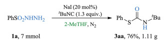 As an easy-to-operate and effective protocol, the gram-scale of carbamothioation reaction has practical significance for the synthesis of various secondary S-thiocarbamates in academic laboratory and industry. When 7 mmol of benzenesulfonylhydrazine (1a) was reacted with tert-butylisonitrile under the standard conditions, the product 3aa could be obtained with a good yield of 76%, demonstrating a great potential application in pharmaceutical synthesis (Scheme 3). However, decreasing the loading of 2-MeTHF led to a decrease in the yield of 3aa.