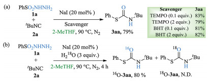 To elucidate the reaction mechanism, some control experiments were carried out as shown in Scheme 4. When 0.1 or 2 equiv. of TEMPO or BHT were added to the reaction mixture under the standard reaction conditions (Scheme 4a) the yield of 3aa was not notably influenced, which revealed that the present carbamothioation reaction may not proceed via a free-radical process but probably in an ionic pathway. Performing the reaction with three equiv. of H218O, no 18O-3aa was observed by GC–MS, suggesting that the oxygen atom of carbamothioate did not originate from water (Scheme 4).
