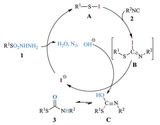 Based on the aforementioned experimental results and the related studies [10, 11], a proposed reaction pathway was illustrated in Scheme 5. First, sulfonyl hydrazide 1 with catalytic amount of iodide resulted in the formation of intermediate R-S-I (A) with the release of N2, H2O and hydroxide (OH-) [13]. Subsequently, the reaction of isonitrile 2 with intermediate A generated the intermediate B, which was attacked by OH- to produce carbonimidothioate intermediate C and regenerated the iodide ion to complete the catalytic cycle. Finally, the intermediate C upon tautomerization (i.e., migration of proton) formed the target product 3.