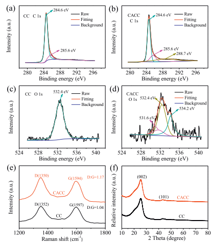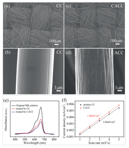 Figure 1. The SEM images of (a, b) CC and (c, d) CACC. (e) UV–vis absorption spectra collected for the original MB solution and for the MB solutions after the adsorptions of CC and CACC. (f) The plots of current densities versus scan rates in the CV tests for CC and CACC.Besides the morphologies and surface areas, the surface chemical compositions of CC and CACC were also comparatively studied by XPS, Raman spectroscopy, and XRD. Figs. 2a and b compare the high resolution XPS spectra of CC and CACC in the C 1s region. The fitted major C 1s peaks at 284.6 eV for both CC and CACC are attributed to the adventitious hydrocarbon, which is usually used as a binding energy reference. The peaks at 285.6 eV for CC and CACC are ascribed to the appearance of C—C bands. Compared with CC, CACC has an additional peak at 288.7 eV for carboxyl carbon [25, 30]. This result indicates that CACC is oxidized to some extent. In Fig. 2c, the O 1s spectrum of the pristine CC only shows a single peak at 532.4 eV corresponding to the —OH group absorbed on the carbon surface. By contrast, the broader O 1s spectrum of CACC could be fitted as three distinct peaks that are absorbed —OH at 532.4 eV, C=O at 531.6 eV, and —OH in —COOH at 534.2 eV (Fig. 2d) [31]. Therefore, the chemical treatment results in the oxidation of the carbon surface to produce —COOH groups. The Raman spectroscopy studies further confirm this observation. The Raman spectra of both CC and CACC in Fig. 2e clearly show the distinct D and G bands of carbon materials. It is found that the intensity ratio of D and G peaks (ID/IG) of CACC (1.17) is higher than that of pristine CC (1.04). The enhanced ID/IG of CACC indicates a higher degree of disorder coupled with more functional groups on its surface. Finally, XRD patterns were collected for CC and CACC to further confirm their chemical components. As shown in the Fig. 2f, all the diffraction peaks of CC and CACC could be indexed to graphite phase, and the peaks at around 25° and 45° are assigned to (002) and (101) planes, respectively. In conclusion, although the chemical treatment does not significantly change the surface area of carbon cloth, it introduces —COOH groups on the carbon surface with graphite phase.