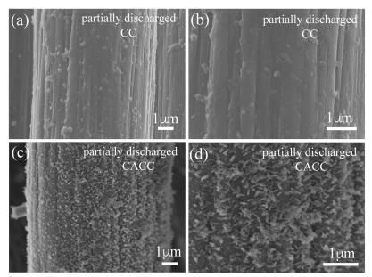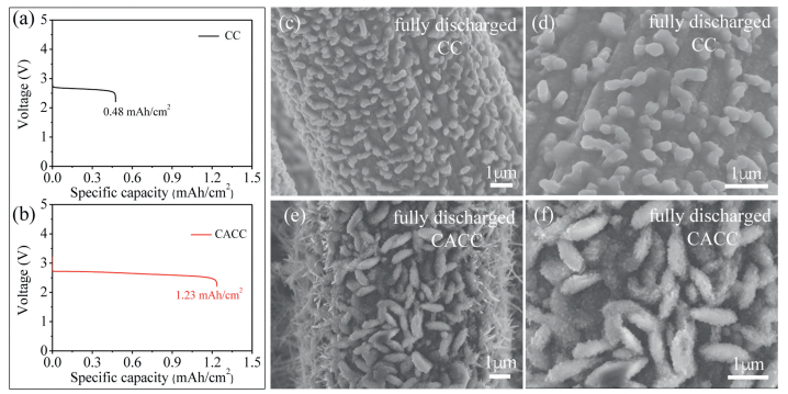To further confirm the mechanism, CC and CACC were discharged at 0.05 mA/cm2 to a cut-off capacity of 0.1 mAh/cm2 were investigated by SEM. As shown in Figs. 4a and b, only few Li2O2 particles are found on the CC surface. In contrast, Figs. 4c and d clearly show that Li2O2 particles are uniformly distributed on the surface of CACC. These initially formed Li2O2 particles act as the nucleation sites for the further discharge, and lead to a significantly enhanced capacity of CACC. In addition to the solution mechanism and nucleation-growth process, the particle sizes of Li2O2 are also regulated by the surface functional groups. When the small Li2O2 aggregation is formed, the electrode surface will be passivated early and thus yield a low capacity. On the contrary, the formation of larger Li2O2 aggregation will prolong the passivation of electrode surface and lead to a relatively high capacity [34–36]. In the present work, as shown in Figs. 3e and f, the formation of toroid-like Li2O2 on CACC surface makes the passivation of CACC surface slower, thus achieving a higher capacity than the pristine CC.