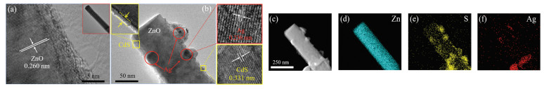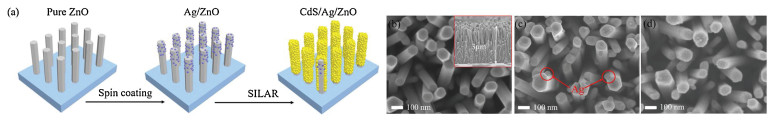 The sandwiched architecture of CdS/Ag/ZnO NRs was fabricated via a three-step process of hydrothermal growth of ZnO NRs, spin-coating for Ag NPs deposition and SILAR for CdS nanocrystallites coating, as schemed in Fig. 1a (Details can be found in Experimental section in Supporting information). In the hydrothermal step, ZnO NRs in hexagonal section shape were grown uniformly on FTO substrates, as shown in Fig. 1b, with diameter around 60~120 nm and length up to 3 μm. Through a simple spin-coating process, Ag NPs with approximate size of dozens of nanometers were deposited on the surface of ZnO NRs (Fig. 1c). The obtained Ag/ZnO film was then coated by CdS nanocrystallites via the SILAR process. As shown in Fig. 1d, CdS nanocrystallites were evenly dispersed on the surface of Ag/ZnO NRs, to form a sandwiched CdS/Ag/ZnO NR structure with rough surface. Given the almost complete coverage of the outmost CdS layer, Ag NPs could be hardly tracked in the CdS/Ag/ZnO NRs from SEM image (Fig. 1d).