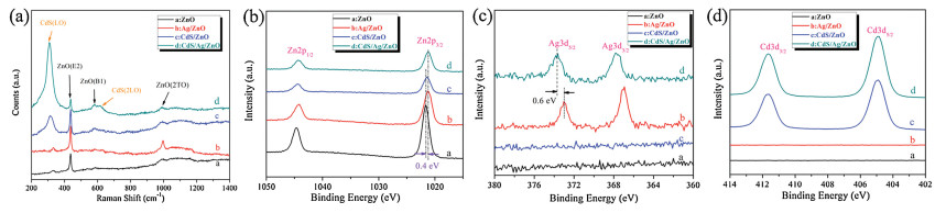 The structures of all samples were characterized by X-ray diffraction (XRD). Fig. S3 (Supporting information) illustrates the XRD patterns of ZnO, Ag/ZnO, CdS/ZnO, and CdS/Ag/ZnO films. All the diffraction peaks can be well indexed to the standard diffraction patterns of wurtzite CdS and wurtzite ZnO [31, 32]. No XRD patterns of Ag NPs were detected, mainly due to the small size and low concentration of Ag NPs. To further investigate the crystal structure, all the samples were characterized by Raman spectra. As shown in Fig. 3a, one can see five obvious peaks. The two peaks located near 300 and 602 cm-1 were related to the active modes of LO and 2LO, respectively, confirming the wurtzite structure of the deposited CdS overlayer [33]. The other three peaks at 436, 580 and 980 cm-1 are the characteristics of wurtzite ZnO, corresponding to the E2 (high) vibrational, silent B1 (high), and 2TO (transverse-optical) modes, respectively [29, 34].