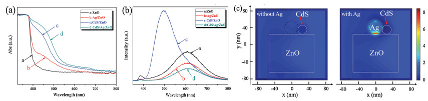 To investigate the optical characteristics of the as-fabricated films, the UV–vis absorption spectra and photoluminescence (PL) spectra were collected. As shown in Fig. 4a, the ZnO NRs show a strong absorption below 380 nm, which matches its band gap of 3.2 eV. After Ag NPs decoration, the obtained Ag/ZnO film shows optical absorption onset red shifted to ~660 nm, with an absorption shoulder at around 420 nm, which corresponds well to the LSPR absorption of Ag NPs [40]. It can be clearly seen that the absorption onset of ZnO NRs deposited with CdS nanocrystallites extends to 530 nm, which can be assigned to the characteristic absorption of CdS (Eg =2.4 eV). With both Ag NPs and CdS nanocrystallites deposited on ZnO NRs, the obtained CdS/Ag/ZnO film shows further enhanced optical absorption in visible light region, due to the synergistic effect of LSPR effect of Ag NPs and narrow band gap of CdS. PL spectra were collected to investigate the charge carrier transfer ability of the obtained films (Fig. 4b). The spectrum of pure ZnO consists of two emission components: a narrow UV peak at around 380 nm, which is assigned to near-band edge exciton emission, and a broad visible peak around 590 nm, which is correlated with deep level emission from intrinsic and extrinsic defects [41]. Compared with pure ZnO film, both the two PL peaks of Ag/ZnO film show intensities greatly decreased. The PRET enhanced charge carrier separation caused by Ag NPs loading might contribute to the UV emission depression [42], while the decrease in visible light peak intensity should be related to the passivation effect of Ag NPs which reduces the surface states or structural defects of ZnO [43, 44]. For the CdS/ZnO film, the decrease in both the UV and visible peak intensities could be traced to the promotion charge carrier separation due to the wellmatched band structures of CdS and ZnO. A new peak standing out at around 500 nm in the spectrum of CdS/ZnO can be assigned to the band gap transition of CdS nanocrystallites [37]. In the PL spectrum of CdS/Ag/ZnO film, the more attenuation in PL peak at around 380 nm and the PL quenching at around 500 nm indicate the more increased charge separation efficiency in CdS/Ag/ZnO due to the synergistic effect of PRET process of plasmonic Ag NPs and heterostructure configured by CdS and ZnO. The decreased PL peak at around 590 nm might be caused by the combined passivation effect of Ag NPs and CdS nanocrystallites. In order to more clearly identify the effect of Ag NPs in CdS/Ag/ZnO NRs on charge carrier transfer ability, we performed finite-difference time domain (FDTD) simulations to calculate the spatial distribution of electromagnetic field intensity of CdS/ZnO films with and without Ag NPs (Fig. 4c). It can be noted that the electromagnetic field density at the interface of Ag/ZnO and Ag/CdS in CdS/Ag/ZnO is much stronger than that of the CdS/ZnO interface without Ag NPs. This enhancement in electromagnetic field density could promote the charge carrier transfer from CdS nanocrystallites to Ag NPs and then from Ag NPs to ZnO NRs. As a result, the electron-hole pairs at the interface of CdS/ZnO are separated more efficiently, which will benefit the enhancement in PEC performance. The obtained optical properties and FDTD results indicate that the CdS/Ag/ZnO NRs present extended photo-response range, strong optical absorbance and excellent charge carrier transfer and separation due to the synergistic effects of Ag NPs and CdS nanocrystallites.