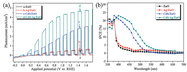 In summary, CdS nanocrystallites sensitized ZnO NRs with plasmonic Ag NPs decoration was fabricated via a spin-coating and SILAR two-step process for PEC solar hydrogen generation. The obtained sandwiched CdS/Ag/ZnO NRs exhibited quite high PEC activity, with photocurrent density achieving 4.7 mA/cm2 at 1.6 V vs. RHE, which is 8 and 1.7 times as high as those of pure ZnO and CdS/ZnO NRs, respectively. Furthermore, with optical absorption onset extended to ~660 nm, the IPCE of CdS/Ag/ZnO photoanode reaches 23.1% and 9.8% at 400 nm and 500 nm, respectively. The PEC enhancement can be attributed to the one-dimensional ZnO NR structure maintained for superior charge transfer, and the extended visible-light absorption of CdS nanocrystallites. Moreover, the incorporated plasmonic Ag NPs could further promote the interfacial charge carrier transfer process and enhance the optical absorption ability, due to its excellent plasmon resonance effect. This study provides an effective strategy to design heterostructured photoelectrodes for efficient solar hydrogen conversion by synergistically extending visible light absorption and improving photogenerated charge carrier separation.