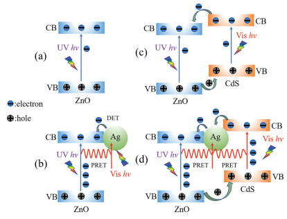 Based on the previous analysis, the enhanced PEC activity of CdS/Ag/ZnO photoanode should be attributed to the synergistic effect of plasmonic Ag NPs and CdS nanocrystallites for the improved optical absorption in visible light as well as the promoted charge carrier separation efficiency. As indicated by the optical absorption spectra, ZnO could only be excited under UV light illumination (Fig. 6a). For Ag/ZnO NRs (Fig. 6b), Ag NPs could slightly increase PEC activity by (i) extending the optical absorption range through the LSPR effect, as indicated by the UV–vis spectra (Fig. 4a) and (ii) promoting charge carrier separation via PRET, as verified by PL spectra (Fig. 4b). For CdS/ ZnO NRs (Fig. 6c), CdS nanocrystallites could significantly expand the photo-response range to 530 nm for its narrow band gap (Fig. 4a) and enhance the charge carrier separation efficiency for the well-matched type Ⅱ band structure alignment between ZnO and CdS (Fig. 4b, Fig. S4 and Table S1 in Supporting information). Therefore, the PEC performance of CdS/ZnO photoanode was remarkably enhanced in UV and visible light region as compared with that of pure ZnO photoanode. The sandwiched CdS/Ag/ZnO photoanode displays significantly increased PEC performances in both UV and visible light region as compared with pure ZnO, Ag/ZnO and CdS/ZnO photoanodes, which can be ascribed to the synergistic effect of Ag NPs and CdS nanocrystallites in improving optical absorption property and enhancing charge carrier separation efficiency (Fig. 6d). On one hand, due to the LSPR effect of Ag NPs and narrow band gap of CdS, the photo-response range of CdS/Ag/ZnO could be effectively extended to ~660 nm. On the other hand, the type Ⅱ band structure alignment between CdS and ZnO facilitates the charge carrier separation. Moreover, the introduction of Ag NPs in the heterostructure accelerates the charge carrier separation at the interface of CdS and ZnO more efficiently due to the PRET effect of Ag NPs.