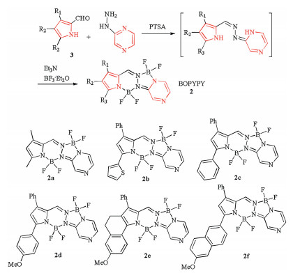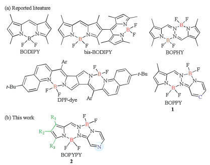 Figure 1. Design strategies for 5, 6, 5, 6-tetracyclic unsymmetric bis(BF2) fluorescent dyes (BOPYPYs) by the fusion of a pyrazine moiety.To achieve the long-wavelength absorption dyes, the arylcontaining pyrroles were employed to synthesize BOPYPYs. Pyrrole-2-carboxaldehyde 3 reacted with 1-(pyrazin-2-yl)hydrazine in the presence of p-toluenesulfonic acid (PTSA) to give the precursor, which was followed by the complexation with Et3N-BF3·Et2O to produce the target compounds BOPYPYs 2 (Scheme 1). The structures of BOPYPYs were confirmed by NMR and FTMS (Supporting information). To the best of our knowledge, this is the first synthesis of pyrazine-fused unsymmetric bis(BF2) fluorescent dye BOPYPY.