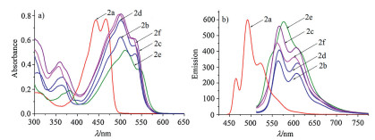 Absorption spectrum of the pyrazine-fused BOPYPY 2a exhibits two main peaks (λabs) at 443 nm and 467 nm, respectively, and its absorption maxima are remarkable bathochromic shifts comparing to those (λabs = 408 and 428 nm) of the pyridine-fused BOPPY 1 reported by Jiao [14]. Due to the different electronegativity between C and N, the discrepant electron withdrawing substitutes between pyridine and pyrazine result in the obvious wavelength difference. BOPYPY 2a emits at 490 nm, 522 nm, and has the obviously large Stokes shifts (79 nm) comparing to the narrow one of the typical BODIPY dye (Table 1). And, the molar extinction coefficients and fluorescence quantum yields between 2a and 1 were comparable. In comparison to 2a, BOPYPYs 2b-2f by the extension of π-conjugation of the corresponding pyrroles, have the long-wavelength absorptions (λabs = 498–546 nm), and their emissions even reach the red region (λem = 560–610 nm). Moreover, BOPYPYs 2b-2f have high molar extinction coefficients, high fluorescence quantum yields, and larger Stokes shifts (96–106 nm) (Fig. 2). Moreover, the computed photophysical data of 2a-2f by TDDFT at the B3LYPG(d) level with Gaussian 09 W (Supporting inforamtion), are in agreement with the experimental data (Table 1).