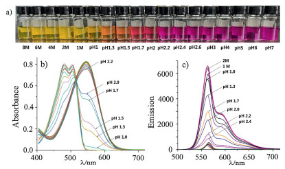 Since the new BOPYPYs were successfully synthesized, their modification and application were investigated. A Knoevenagel reaction of BOPYPY 2a with 4-dimethylaminobenzaldehyde smoothly produced dye 4 bearing the extension of π-conjugation (Scheme 2) [21, 22]. Comparing to these of dyes 2a-2f, dye 4 has a relative long-wavelength absorption (λabs = 546 nm). The most popular strategy for pH-responsive fluorescent sensors takes advantage of intramolecular charge transfer (ICT) or the photoinduced electron transfer (PET) [23, 24]. Dimethylamino group is one of the fragments frequently used for the purpose of ICT. So, herein we explore the response of the dimethylamino-containing BOPYPY 4 to pH values.