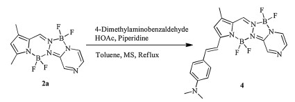 In conclusion, tetracyclic pyrazine/pyrrole-fused unsymmetric bis(BF2) fluorescent dyes (BOPYPYs) were synthesized by reaction of pyrrole-2-carboxaldehyde with 1-(pyrazin-2-yl)hydrazine in the presence of Et3N-BF3·Et2O. The absorption maxima of pyrazine-fused BOPYPY 2a are remarkable bathochromic shifts comparing to those of BOPPY 1, indicating that the discrepant substitute groups between pyridine and pyrazine result in the obvious wavelength difference. The new series of BOPYPYs 2a-2f possess high molar extinction coefficients, high fluorescence quantum yields, and larger Stokes shifts. Moreover, a Knoevenagel reaction of BOPYPY 2a with 4-dimethylaminobenzaldehyde smoothly produced dye 4 bearing the dimethylamino group. BOPYPY 4 as a pH-responsive fuorescent sensor could detect pH value.