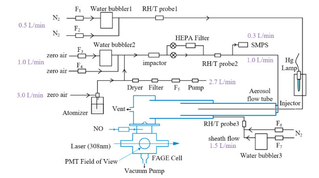 Uptake coefficient γ(HO2) is the probability that a HO2 radical losses due to collision onto surface of aerosol. γ(HO2) on aerosol was first measured by Mozurkewich et al. [16] using aerosol flow tube coupled with a chemical amplification system. They found dramatic HO2 loss owing to heterogeneous reaction on Cu(Ⅱ)-doped aqueous aerosol [16]. Since then, uptake of HO2 onto dry salt films, solid films of dusts, dry aerosol, aqueous aerosol and organic aerosol are determined in laboratory [17-27]. The measured γ(HO2) on aqueous (NH4)2SO4 aerosol varied a lot from 0.003 to 0.1 among different research groups (Table 1). In addition, the γ(HO2) had a difference of one order of magnitude, no matter onto dry or aqueous aerosol. For dry particle the reasons may be the difference of experimental conditions (pressure, humidity) and effective surface area. For aqueous aerosol, trace metal contamination may contribute to the discrepancy among previous studies. Dramatic enhancement of γ(HO2) up to 0.4–0.5 was consistently found after sufficient Cu(Ⅱ) doped in aerosol [19, 20, 23]. There remains much to be known about heterogeneous uptake of HO2 onto aqueous (NH4)2SO4 aerosol with and without copper ions. It is essential to quantitatively determine the uptake coefficient of HO2 on (NH4)2SO4 aerosol as well as the influence of Cu(Ⅱ) concentration on γ(HO2). The Cu(Ⅱ) concentration dependence of γ(HO2) may greatly influence the magnitude of γ(HO2). However, few studies have determined the γ(HO2) changed with different Cu(Ⅱ) concentration at atmospheric level of HO2 concentration till now [28, 29]. As the concentration of Cu(Ⅱ) in aerosol significantly influenced γ(HO2), it is vital to know the relationship between these two parameters. In this study, aqueous (NH4)2SO4 aerosol was chosen as the target system. (NH4)2SO4 aerosol is one of the most typical continental aerosols. The formation of (NH4)2SO4 aerosol enhanced the formation of ammonia salts in aqueous aerosol [30]. In addition, ambient aerosols are aqueous during heavy polluted period [31]. We want to figure out if there exists a threshold of copper ion concentration for γ(HO2) elevation under certain humidity. Cu ion is selected mostly because its reaction rate with HO2 is 100 times higher than that of Fe ion although the concentration of dissolved Fe in ambient aerosol is several tens of times higher than that of dissolved Cu [32].