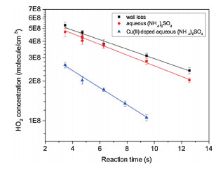 Thirdly, the HO2 uptake coefficients for aqueous (NH4)2SO4 aerosols doped with CuSO4 were measured. As shown in Fig. 2, HO2 loss rate on Cu(Ⅱ)-doped (NH4)2SO4 aerosol was significantly higher that the loss rate on aqueous (NH4)2SO4 aerosol. That is because Cu(Ⅱ) ions catalyze O2- and HO2 reactions in the aqueous phase, which accelerates HO2 loss through the following reactions (R1–R4):