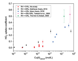 Figure 3 Measured HO2 uptake coefficients onto Cu(Ⅱ) doped aqueous (NH4)2SO4 aerosols at 51% RH (circles) in this study and other previous studies (at 65% RH (squares) in [44], at 43% RH (diamonds) in [40], at 45%-55% RH (up triangle) in [18] and at 42% RH (down triangle) in [17]). The error bars are 2 standard deviations.