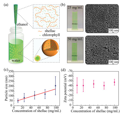 Figure 1 Controlled preparation of chlorophyll-loaded shellac nanoparticles. (a) Schematic illustration of the particle preparation. Solution of chlorophyll and shellac polymer in ethanol is quickly injected into a water reservoir, which coprecipitate upon a rapid mixing of ethanol with water, forming chlorophyll-loaded nanoparticles. (b) Transparent dispersions of the nanoparticles in water, imparting a green color. (c) Linear dependence of the particle size on the concentration of shellac in ethanol. The red line is a linear fit of the experimental results. (d) A high negative zeta potential of about ζ~-40 mV observed in different sizes of nanoparticles, suggesting a good dispersion stability in water.