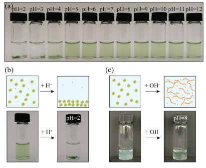 Figure 2 Dispersity of chlorophyll-loaded shellac nanoparticles over a wide pH range. (a) Dispersity of shellac nanoparticles at different pHs. (b) At pH 2, the carboxylic groups of shellac nanoparticles are deprotonated, leading to the aggregation and sedimentation of the nanoparticles. (c) At pH 8, shellac nanoparticles are dissolved, releasing chlorophyll in water, and the solution becomes clearer.