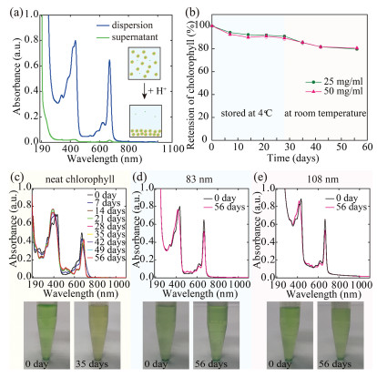 Figure 3 High encapsulation efficiency and improved stability of chlorophyll in shellac nanoparticles. (a) UV–vis absorptions of chlorophyll loaded in shellac nanoparticles (blue curve) and unencapsulated chlorophyll left in the supernatant (green curve) when the nanoparticles aggregate and settle down at pH 2, suggesting an encapsulation efficiency of 97%. (b) Retention of chlorophyll encapsulated in shellac nanoparticles of d~83 nm (green curve) and d ~108 nm (pink curve) stored at 4 ℃ for 28 days and then at room temperature for 28 days. (c–e) UV–vis absorption spectra of unencapsulated chlorophyll and chlorophyll loaded in shellac nanoparticles of d ~83 nm and d ~108 nm, respectively. The absorption peak of unencapsulated chlorophyll shifts from 670 nm to 690 nm over time and the solution color changes from green to yellow due to the degradation of chlorophyll. In contrast, the absorption peak of encapsulated chlorophyll at 670 nm only slightly decreases over time, showing a consistent green color.