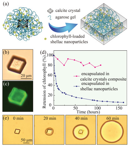 Figure 4 Encapsulation of chlorophyll-loaded shellac nanoparticles in gel-grown calcite crystals. (a) Schematic diagram illustrating that the nanoparticles are immobilized by the agarose gel and embedded in the calcite crystal as it grows. (b) Optical and (c) fluorescent microscope images of a nanoparticle-incorporated calcite crystal. The fluorescence is attributed to the chlorophyll loaded in the nanoparticles. (d) Retention of chlorophyll under LED light when encapsulated in shellac nanoparticles (blue curve) and in calcite crystal composites (pink curve). (e) Dissolution of the calcite crystal and release of the nanoparticles under the acidic condition.
