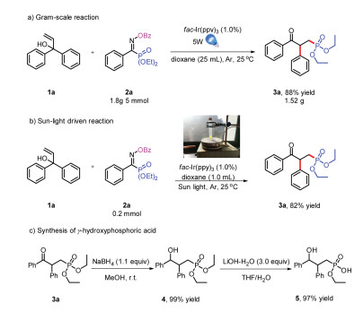 Several experiments were implemented to highlight the synthesis value of this method. The reaction proceeded very well with gram-scale yield of 88% (Scheme 5a). Furthermore, when the sunlight was used instead of 5 W blue LEDs, the desired product could also be obtained with 82% yield (Scheme 5b). Meanwhile the γ-oxo-phosphonate was easily derivatized to obtain γ-hydroxyphosphoric acid 5 (Scheme 5c) [9]. These results highlight the synthesis value of this tactic in drug discovers.