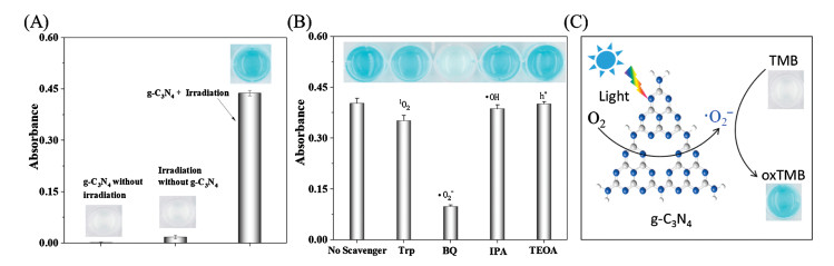Figure 1. (A) The photooxidase activity of g-C3N4; (B) The effect of scavenger of oxidation on TMB; (C) The principle of g-C3N4-catalyzed oxidation of TMB. Experimental conditions: g-C3N4 concentration: 20 μg/mL; solution pH 4.0; TMB concentration: 0.5 mmol/L; LED color: blue.Subsequently, we further investigated the reactive oxygen species (ROS) produced during the g-C3N4 photo-catalyzed oxidation of TMB by adding a series of free radica scavengers. Typically, tryptophan (Trp), isopropanol (IPA), p-benzoquinone (BQ) and triethanolamine (TEOA) were used as scavengers for 1O2, ·OH, ·O2- and h+, respectively. As shown in Fig. 1B, the ·O2- scavenger BQ has an obvious inhibitory effect on the photooxidation of TMB. This result revealed that the TMB oxidation catalyzed by g-C3N4 photooxidase nanozyme was mainly ascribed to ·O2- that was generated during LED-irradiation of g-C3N4 (Fig. 1C).
