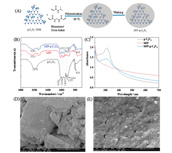 Surface modification is essential for improving the performance of nanozyme [33]. g-C3N4, similar to other nanozyme, is active to interact with biomolecules in sample matrix, leading to a positive or negative matrix interferences. We hope the MIP layer on g-C3N4 only permit substrate molecule to binding sites and leave the biomolecules such as protein, amino acid in the sample matrix outside it. Such a selective binding to the MIP-g-C3N4 can greatly suppress the matrix interference. To achieve this, the substrate TMB molecules were firstly adsorbed on the surface of g-C3N4. Then, NIPAAm as monomer and MBAAm as cross linker were added to the g-C3N4-TMB mixture. The system underwent thermalinduced polymerization at 80 ℃ to yield MIP layer on g-C3N4. Finally, the TMB template was removed away to create binding sites (Fig. 2A).
