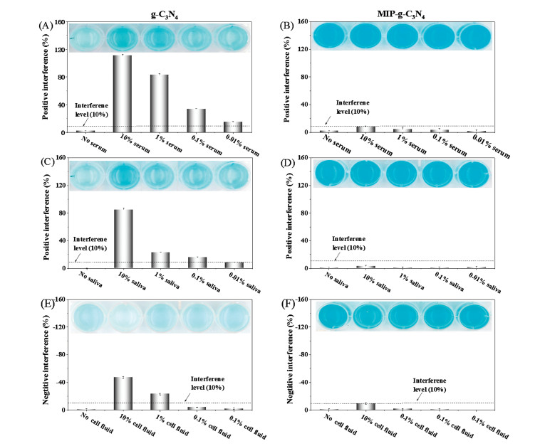 Human serum, a typical biological sample, was firstly used for the investigation of matrix-interference on bare g-C3N4 and MIP-g-C3N4 enzymatic activity. Fig. 3A showed that serum matrix has a serious positive interference on the enzymatic activity of bare g-C3N4, and there is still 18% positive interference even for 0.01% serum samples. After imprinting, the MIP-g-C3N4 nanozyme greatly enhanced the anti-interference ability, as shown in Fig. 3B. Up to 10% of serum samples cause < 10% interference in the coloration using MIP-g-C3N4 nanozyme. Hence, the matrix interference from serum sample can be alleviated over 1000 fold after imprinting. The matrix interference from other biological samples like saliva and cell fluid can be also greatly reduced by imprinting (Figs. 3C–F).