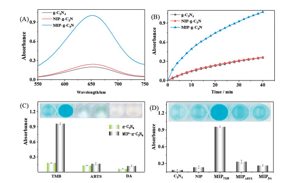 Substrate specificity is also important to nanozyme mimics. In order to prove the specificity, the nanozymes was used for catalyzed-oxidization of different substrate, i.e., TMB, ABTS and DA. As shown in Fig. 4C, the bare g-C3N4 can oxidize all the substrate. After TMB-imprinting, the oxidation activity for TMB was improved about 4.7-fold, whereas only 1.1 and 1.3 for ABTS and DA. To test further whether the specificity of MIP is substratedependent, MIP with different templates TMB (MIPTMB), ABTS (MIPABTS) and DA (MIPDA) was also used for oxidation of TMB. Fig. 4D showed that MIPABTS and MIPDA possess a similar enzymatic activity comparing with NIP, whereas MIPTMB-g-C3N4-catalyzed oxidation of TMB yielded the deepest blue color.