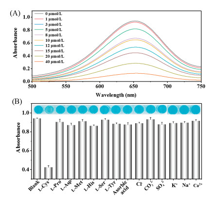 The MIP-g-C3N4 nanozyme was applied for detection of Lcysteine, an important marker of several diseases, such as cancer and Alzheimer's disease. Since the oxidation reaction of TMB can be inhibited by L-cysteine, a simple sensing assay for L-cysteine detection is developed based on the inhibition activity of TMB oxidation (Fig. S8 in Supporting information). As depicted in Fig. 5A, the absorbance values of the oxTMB gradually decrease with the increase of L-cysteine concentrations. The linear response for Lcysteine detection ranged from 1 μmol/L to 20 μmol/L (Fig. S9 in Supporting information) with a limit of detection about 0.2 μmol/L. The MIP-g-C3N4-based sensing system were more sensitive than most of the reported nanozyme-based assays for L-cysteine detection (Table S1 in Supporting information). In addition, the selectivity experiment for L-cysteine detection was also evaluated by testing the response to a series of other amino acids and ions. Fig. 5B showed that only the target analyte L-cysteine can lead to inhibit the oxidation of TMB, demonstrating the good selectivity of the sensor. The MIP-g-C3N4-based assay was also applied for detection of L-cysteine in spiked serum samples with recoveries ranging from 91.6% to 94.1%.