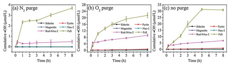 In this work, the hydroxyl radical formation upon dark oxidation of various reduced iron minerals, including siderite (FeCO3), magnetite (Fe3O4), pyrite (FeS2), reduced nontronite (ironbearing smectite clay), and mackinawite (FeS), was compared at different oxygen conditions. The interactive effects of mackinawite with environmental factors (pH, Cl- and DOM) were investigated on the formation of hydroxyl radical.