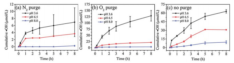 Figure 1. Cumulative ·OH production upon dark oxidation of various iron minerals (0.483 g/L Fe, pH 6.5) under (a) N2 purge, (b) O2 purge and (c) no purge.The effect of pH on ·OH production was further investigated by using mackinawite as an iron mineral model (Fig. 2). Cumulative concentrations of ·OH decreased sharply from 62.95 μmol/L to 9.44 μmol/L as the initial pH increased from 3.6 to 8.0. Similarly, it declined from 129.01 μmol/L to 3.87 μmol/L with pH changing from 3.6 to 8.0 under O2 purging. The higher ·OH generation at lower pH is attributed to (1) partial dissolution of FeS particles and thus enhanced release of Fe2+ (Fig. S5 in Supporting information), and (2) decreased ·OH generation efficiency in homo- and heterogeneous Fenton reactions at higher pH [31]. The absence of H+ should inhibit the decomposition of H2O2 and the subsequent production of ·OH [32]. Moreover, the ferrous minerals are deactivated with the formation of ferric oxyhydroxide at higher pH [33].