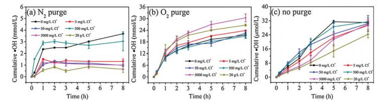 Fig. 3 shows the ·OH production by mackinawite in the presence of varying Cl- concentrations. Generally, in the concentration range of 0–20 g/L, Cl- had a limited effect on ·OH production under O2 purging. However, without purging, the ·OH production kinetics changed with the increasing Cl- concentration. At lower Cl- concentrations, a biphasic ·OH production was observed, generally being quick within the initial 1 h and slowing down afterwards. However, with further increase of Cl- concentration, a pseudo-linear formation kinetics of ·OH was observed, especially at 20 g/L of Cl- concentration. In addition, the increasing of Cl- concentration to 20 g/L also lowered the ·OH production by 27% (from 30 μmol/L to 22 μmol/L). The effect of Cl- can be attributed to (1) the complexation of Cl- and Fe2+/3+ decreases the formation of ·OH [34], and (2) Cl-, as a radical scavenger, decreases the steady state concentration of ·OH [35].