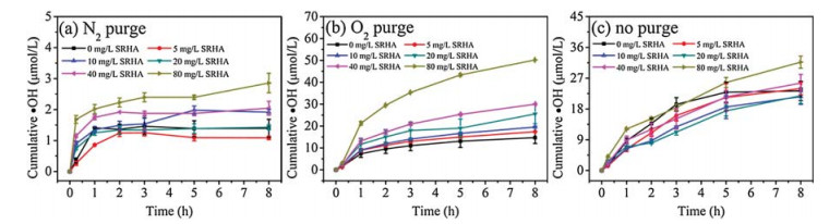The effect of ubiquitous DOM on ·OH formation from mackinawite was probed by using Suwannee River humic acid (SRHA) asa model(Fig. 4). Although DOM could produce ·OH under sunlight irradiation [2], it can also act as a scavenger of this highly reactive radical [36, 37]. Surprisingly, increasing DOM concentration (from 0 to 80 mg/L as total organic carbon) slightly enhanced ·OH formation from 23.92 μmol/L to 31.70 μmol/L without purging, but this enhancement was significant under O2 purging as ·OH formation increased from 14.70 μmol/L to 50.24 μmol/L. Despite that the ·OH formation was lower with O2 purging than no purging in the absence of DOM, O2 purging greatly increased the ·OH formation in the presence of 80 mg/L DOM. This finding is significant considering the ubiquitous co-occurrence of DOM with iron minerals in soil, overlying water, and sediment. Similarly, lowmolecular-weight organic acids (LMWOAs) (e.g., citrate and oxalate) also enhanced the ·OH production from pyrite oxidation [21]. It was proposed that LMWOAs could increase the dissolution of pyrite and the formation and oxidation of Fe2+-LMWOA complexes by O2, which in turn mainly contributed to ·OH production [21]. In addition, the acceleration of pyrite oxidation by Fe3+-LMWOAs could also increase ·OH production [21]. We observed that DOM significantly increased the dissolved Fe2+ and Fe3+ under oxic condition, but not at anoxic condition (Fig. S6 in Supporting information). This result supports that the complexation of Fe2+ or Fe3+ with DOM [38, 39] increased the electron transfer from mackinawite to O2 and then enhanced the ·OH production.